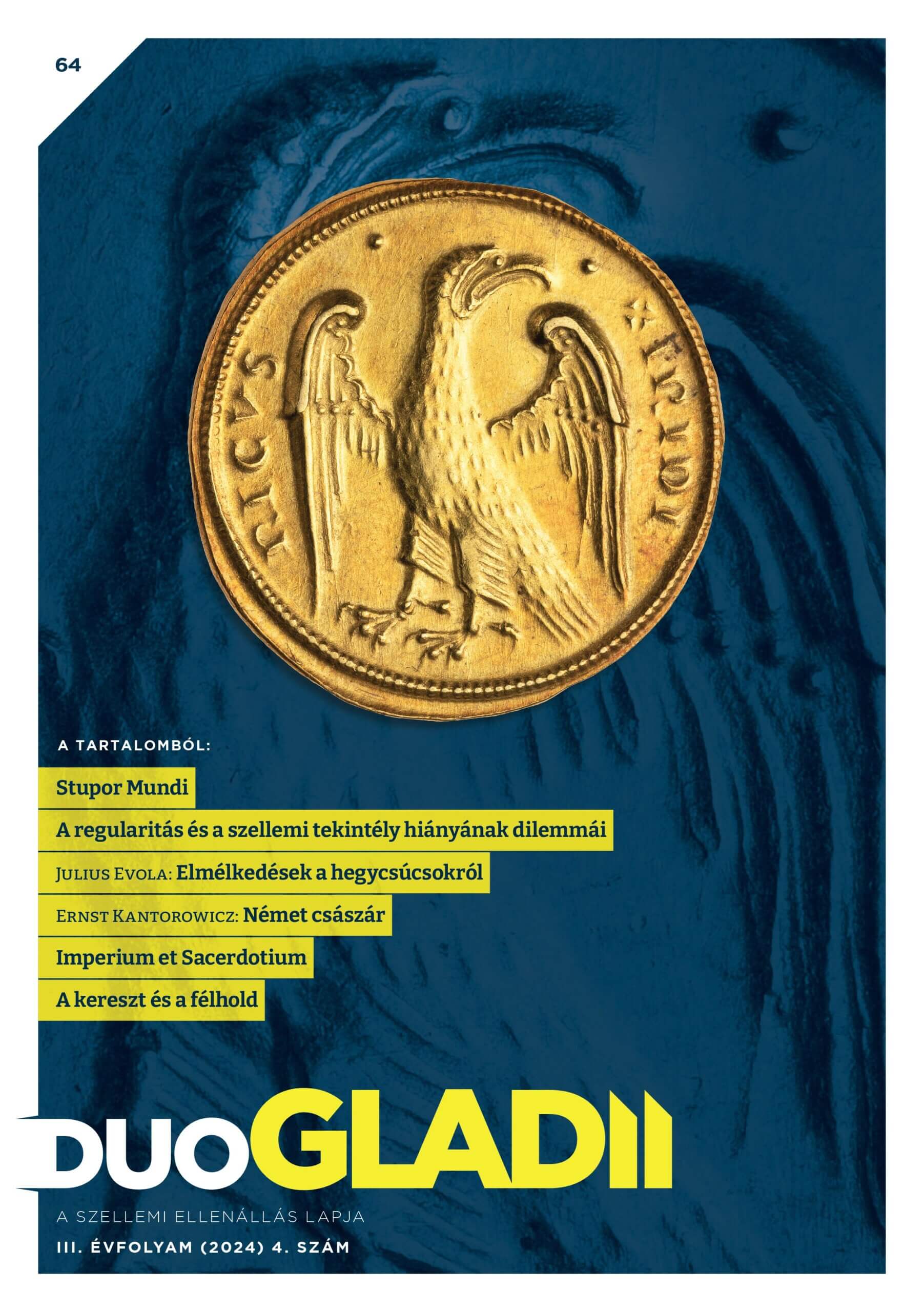Megjelent a Duo Gladii civilizációkkal foglalkozó tematikus sorozatának következő száma, amely a Német Nemzet Szent Római Birodalmát, annak is a legfénytelibb időszakát, a Hohenstaufen-dinasztia, vagyis a ghibellinek uralmát helyezi a középpontba. Azt az érát, amelyben olyan legendás császárok formálták a történelmet, építették döngő léptekkel az új Római Birodalmat, mint Barbarossa Frigyes és a szicíliai normann ősökkel is büszkélkedő II. Frigyes, a középkor legkülönlegesebb tradicionális uralkodója. A tematikán kívüli írásokban többek között szó esik az Antikrisztus uralmáról, a keresztény cionizmusról, a művészettörténet óra eltörléséről, az antifák rabláncra veréséről és a HVIM közelgő ifjúsági táboráról is.